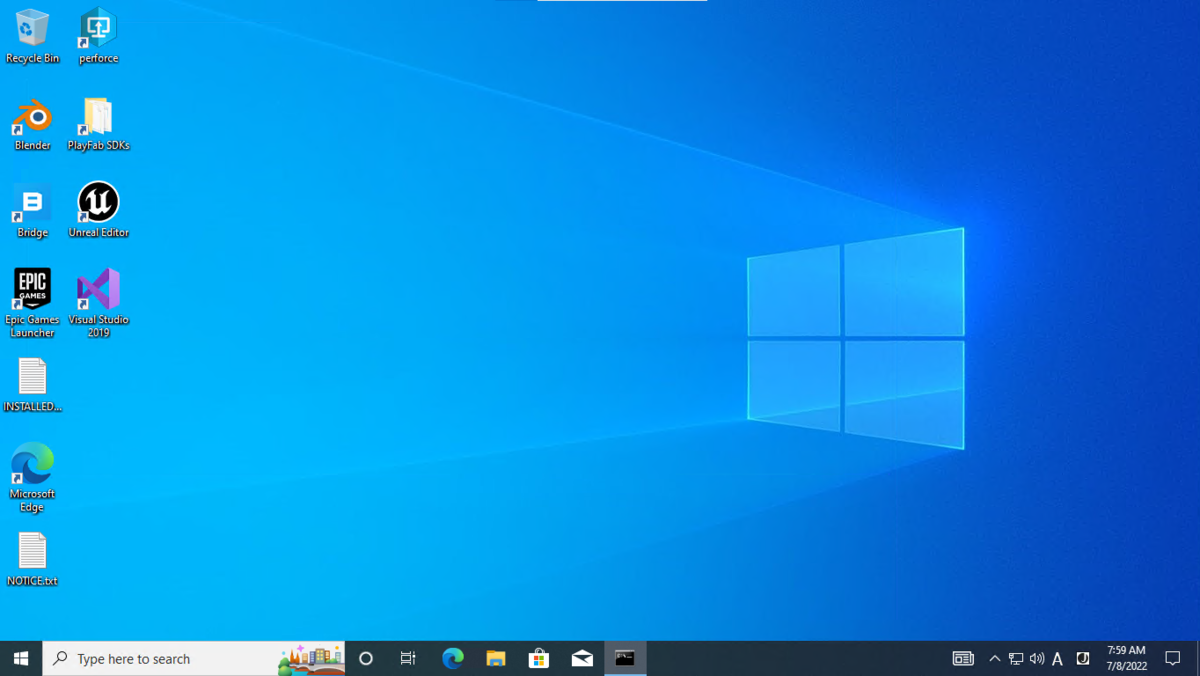 - デスクトップ画面です。Unreal EngineだけでなくBlenderやQuixel Bridge、Visual Studioもこの時点でインストール済みです。