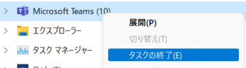 Teamsが実行中の場合は、タスクバーから「Microsoft Teams」を右クリック「タスクの終了」を選択します。