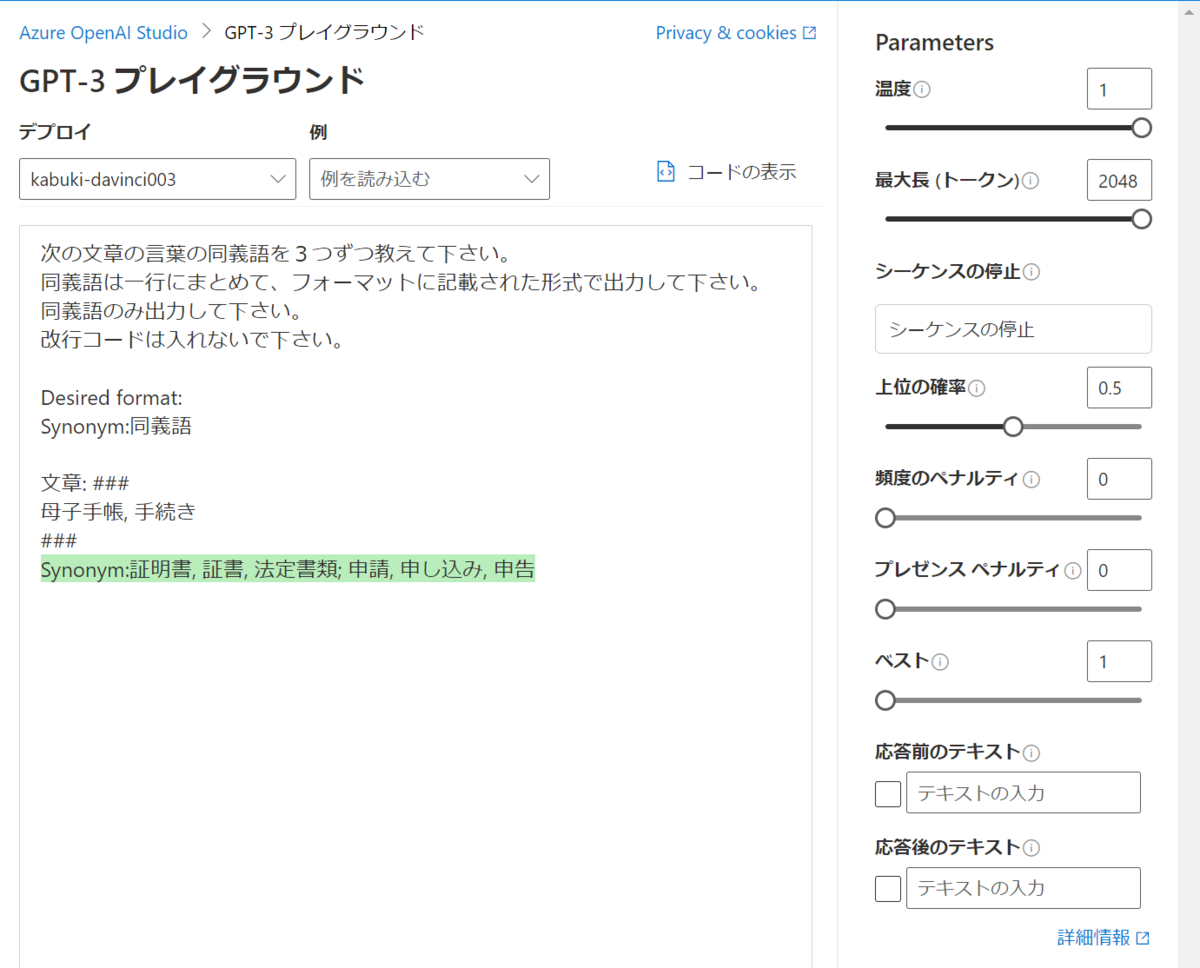 デプロイモデルはtext-davinci-003を使用しました。