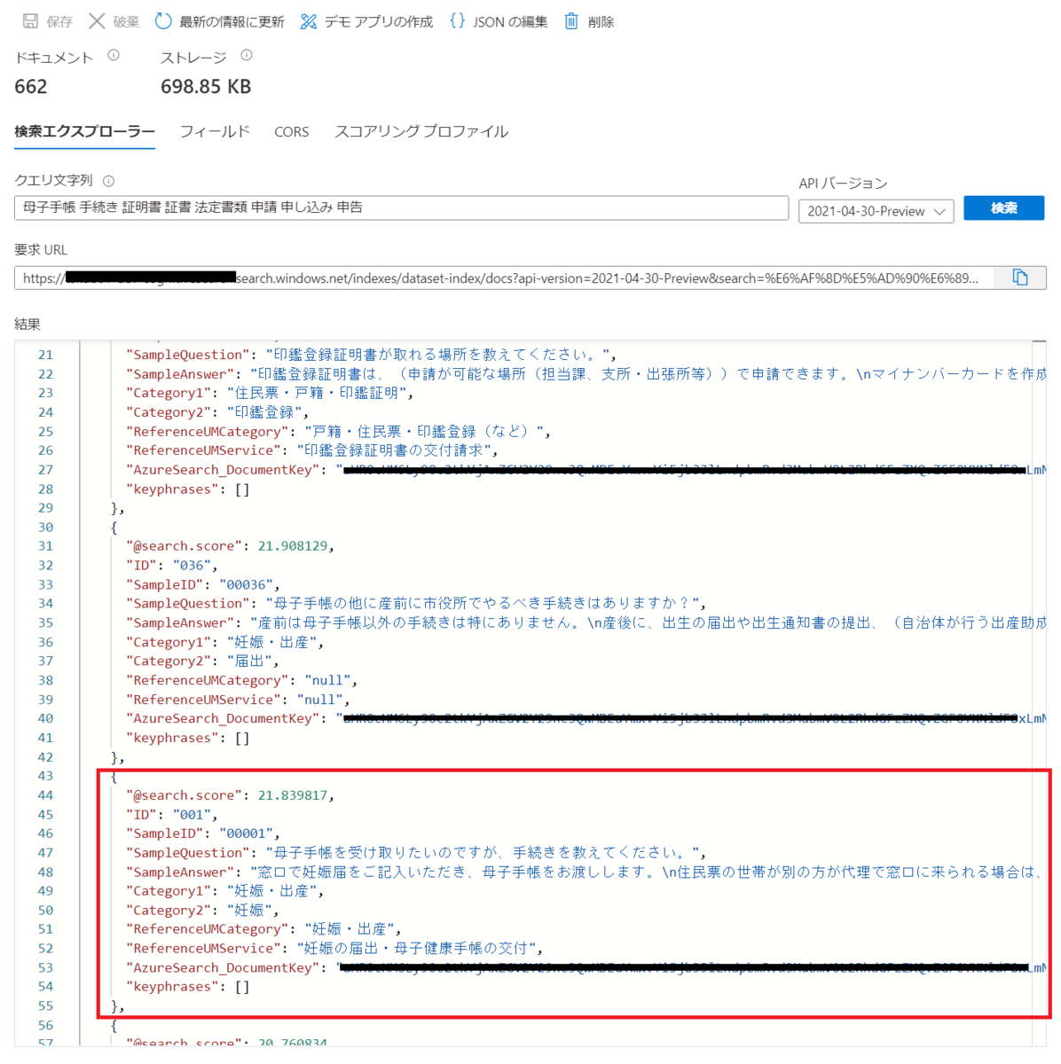 目視で確認したところ、search.scoreが上位から4番目の箇所に回答として相応しいデータが表示されています。