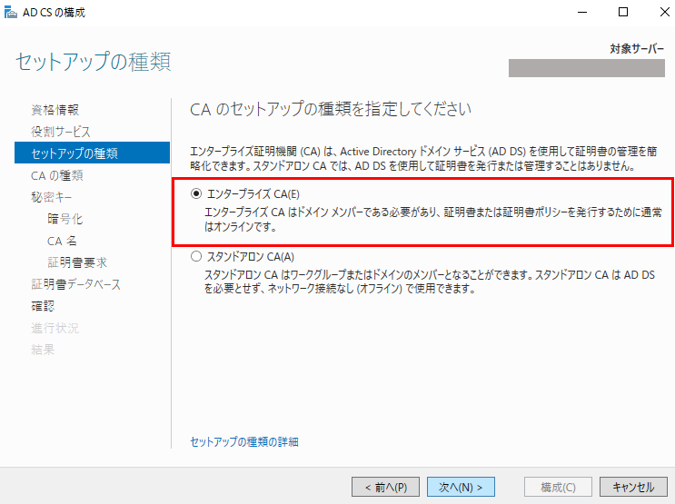 対象サーバーへActiveDirectory証明書サービスの構成