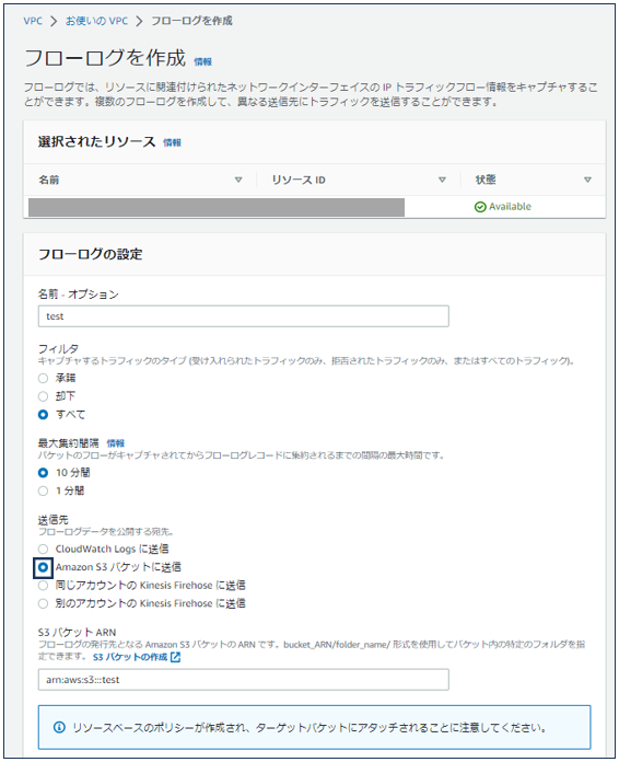 キャプチャするトラフィックを承諾、却下、すべてのトラフィックから選択することが可能です。デフォルトではすべてが指定されていますが、承諾を選択すると、通信が問題なく行われたトラフィックのみをS3に格納する設定となります。反対に、却下を選択すると、通信がうまく行われなかったトラフィックのみをS3に格納します。