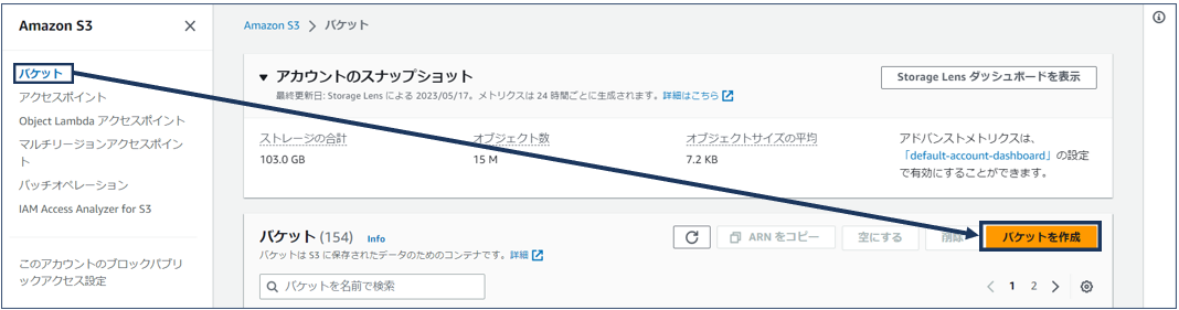 AWSコンソールのAmazon S3から左ペインの[バケット]>[バケットを作成]を選択