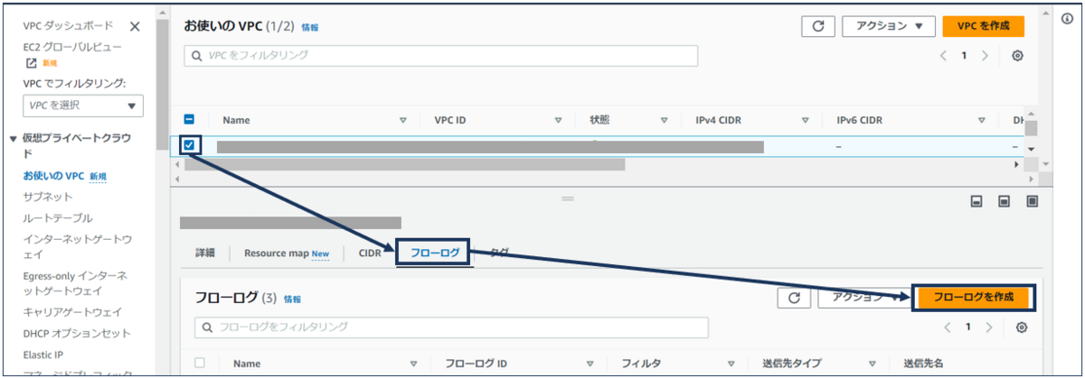 AWSコンソールのVPCから対象のVPCを選択し[フローログ]タブ>[フローログを作成]を選択