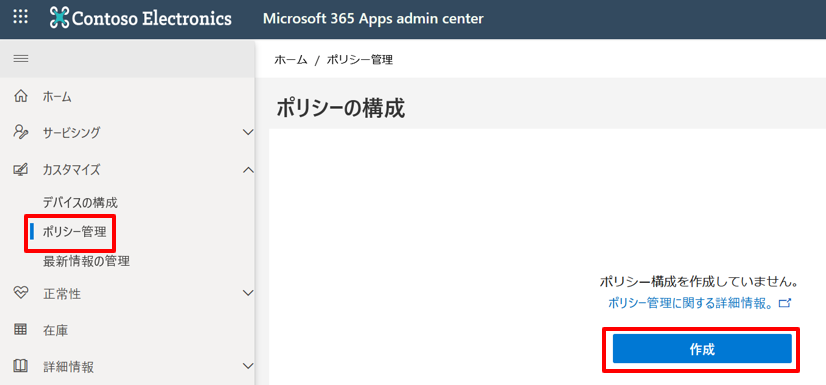 3.ログインした画面の左側のメニューから [カスタマイズ] >[ポリシー管理]の順で選択し、[作成]または、既存のポリシー構成を編集する。