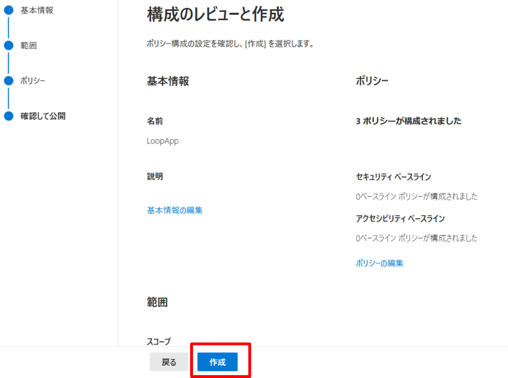 7.確認して公開画面で設定した内容を確認し[作成]をクリックする。