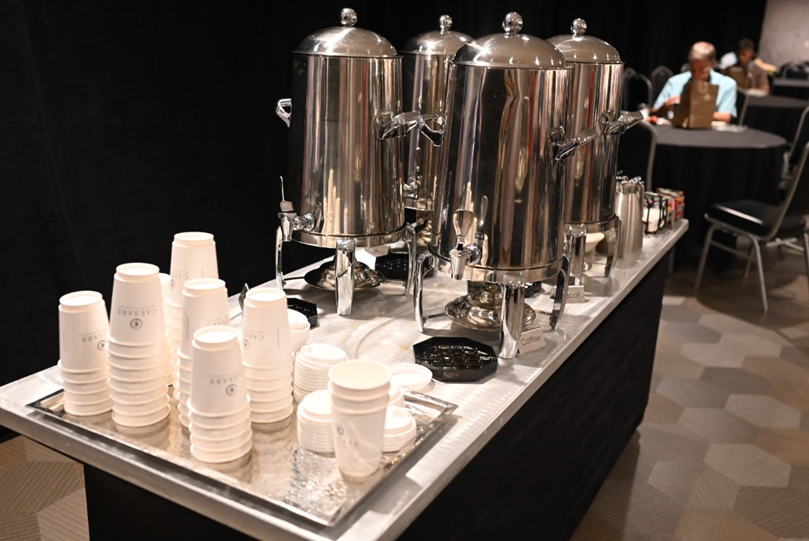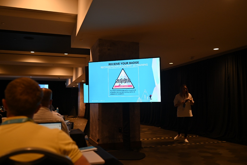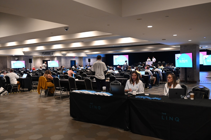 朝8時、まずはトレーニングワークショップに向かう前にCAESARS FORUMでサミット参加バッチを受け取ります。