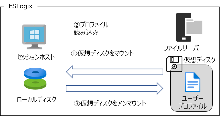 ログオンの際には仮想ディスクをマウントすることでプロファイルの読み書きを行います。