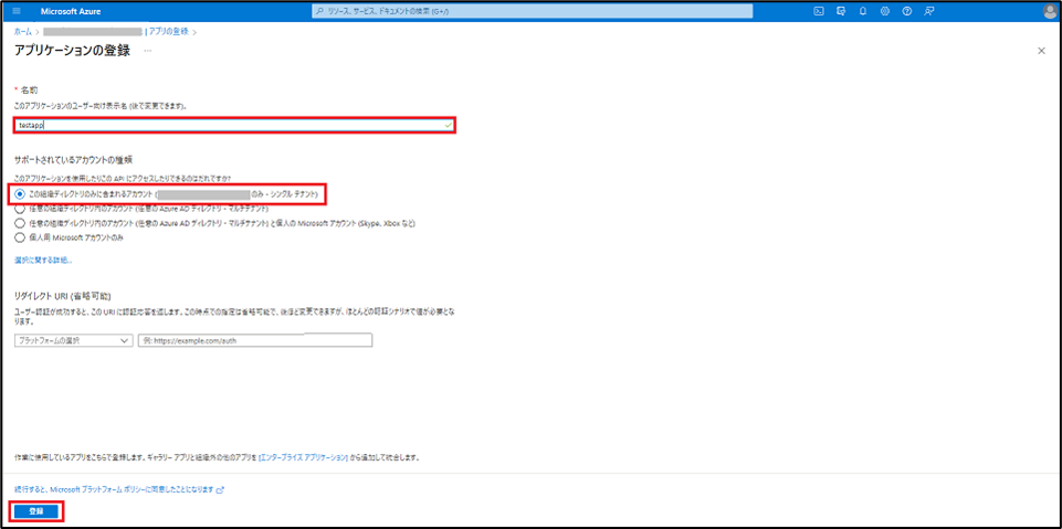5.[アプリケーションの登録]画面にて、必要事項を入力し、[登録]をクリックします。