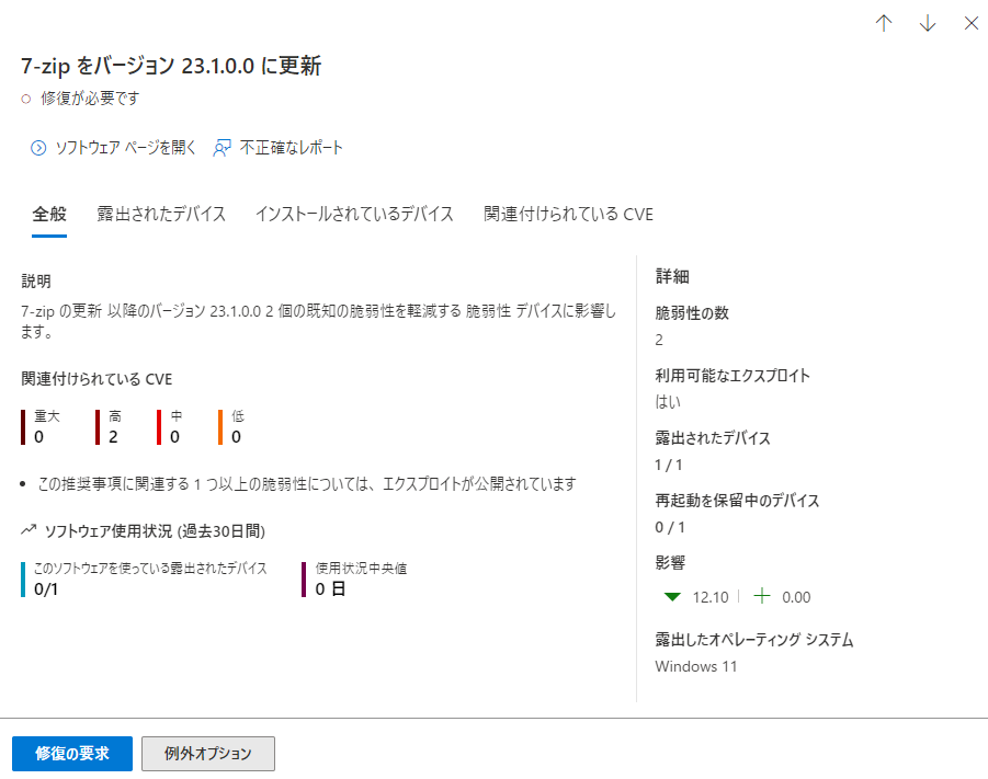 どのデバイスが古い 7zip をインストールしているかを [インストールされているデバイス] タブから確認して、アプリケーションのアップデートを行うことになるかと思います。