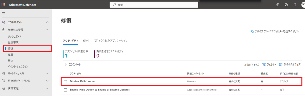 作成後に MDfE 管理者ポータルから 脆弱性の管理 > 修復 の順にクリックすると作成した項目が表示されます。