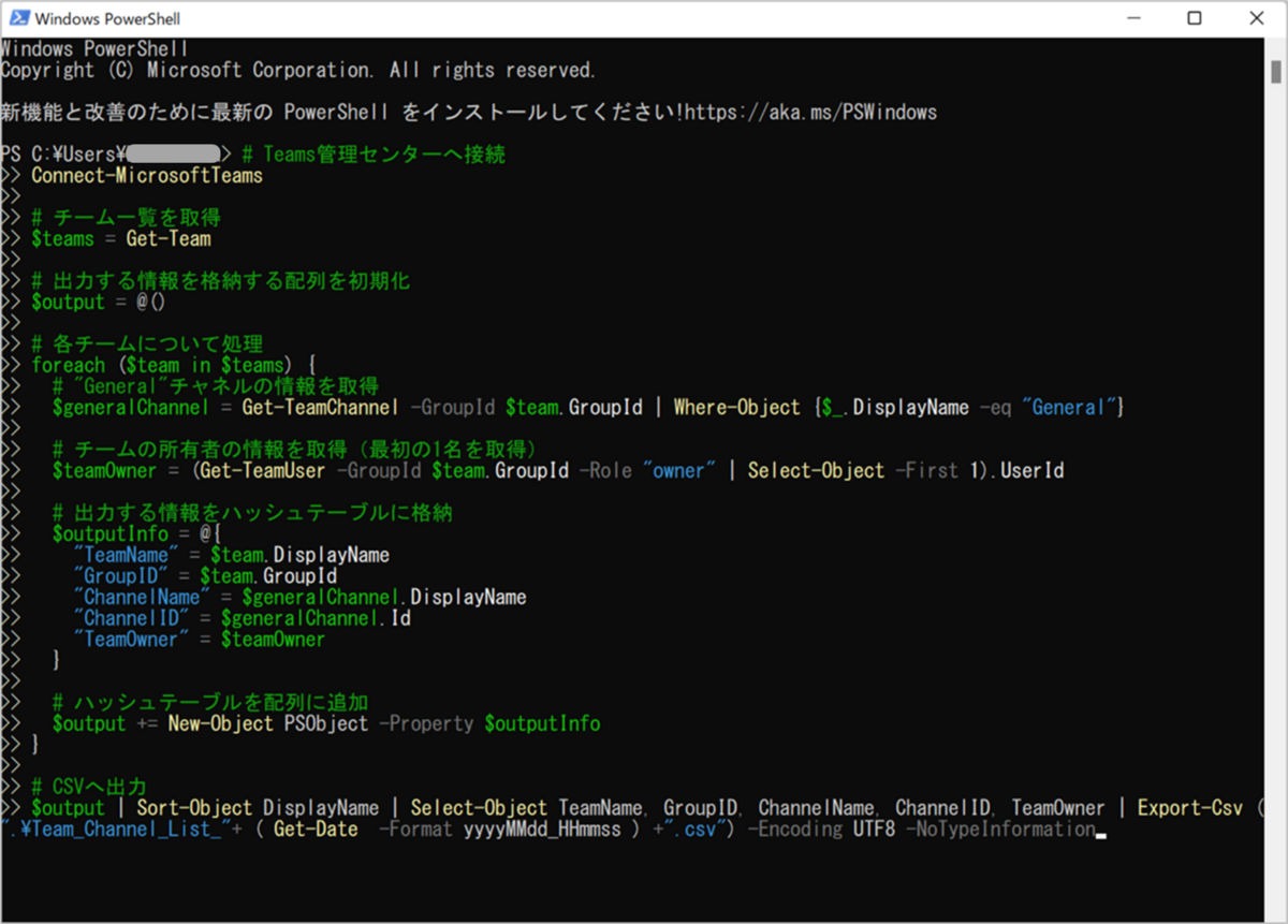 # Teams管理センターへ接続 Connect-MicrosoftTeams # テナント内の全チームを取得 $teams = Get-Team # 出力する情報を格納する配列を初期化 $output = @() # チームごとに以下処理を繰り返し foreach ($team in $teams) { # "General"チャネルの情報を取得 $generalChannel = Get-TeamChannel -GroupId $team.GroupId | Where-Object {$_.DisplayName -eq "General"} # チームの所有者の情報を取得(最初の1名を取得) $teamOwner = (Get-TeamUser -GroupId $team.GroupId -Role "owner" | Select-Object -First 1).UserId # 出力する情報をハッシュテーブルに格納 $outputInfo = @{ "TeamName" = $team.DisplayName "GroupID" = $team.GroupId "ChannelName" = $generalChannel.DisplayName "ChannelID" = $generalChannel.Id "TeamOwner" = $teamOwner } # ハッシュテーブルを配列に追加 $output += New-Object PSObject -Property $outputInfo } # CSVへ出力 $output | Sort-Object DisplayName | Select-Object TeamName, GroupID, ChannelName, ChannelID, TeamOwner | Export-Csv (".\Team_Channel_List_"+ ( Get-Date -Format yyyyMMdd_HHmmss ) +".csv") -Encoding UTF8 -NoTypeInformation