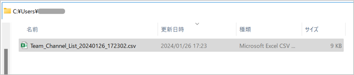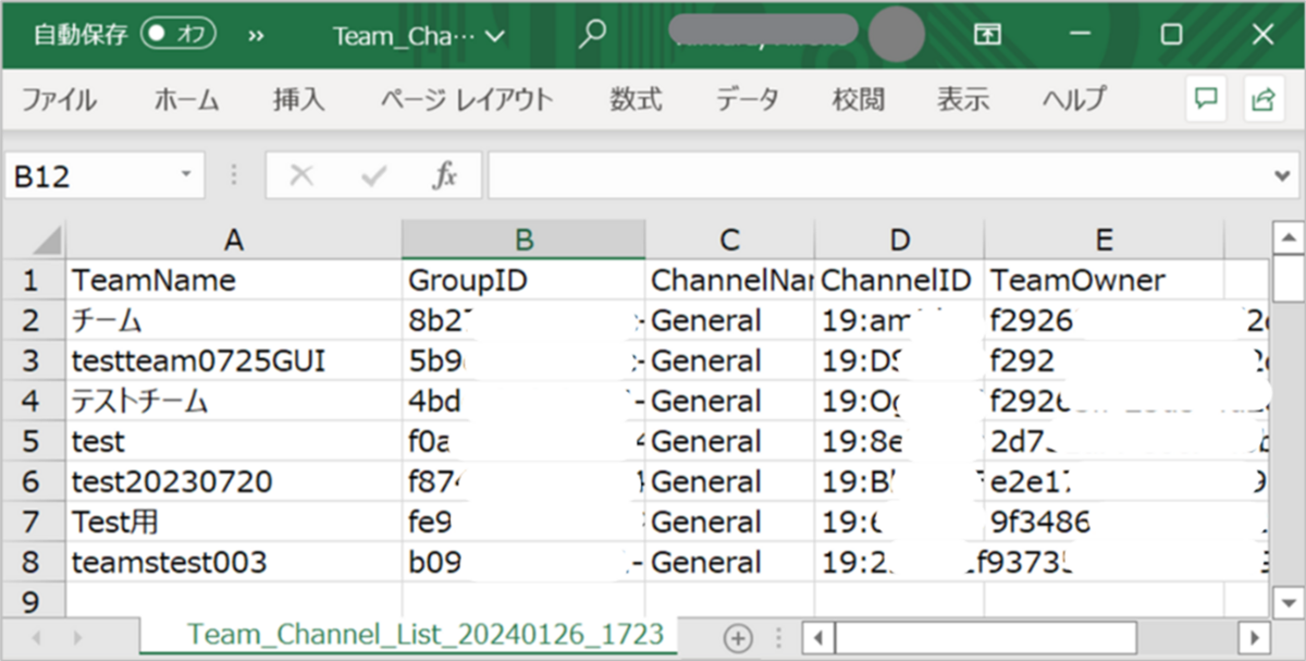 処理が終了すると、コマンドを実行したディレクトリに「Team_Channel_List_yyyymmdd_hhmmss.csv」の名前でCSVファイルが出力されます。(yyyymmdd_hhmmssはCSV出力日時)