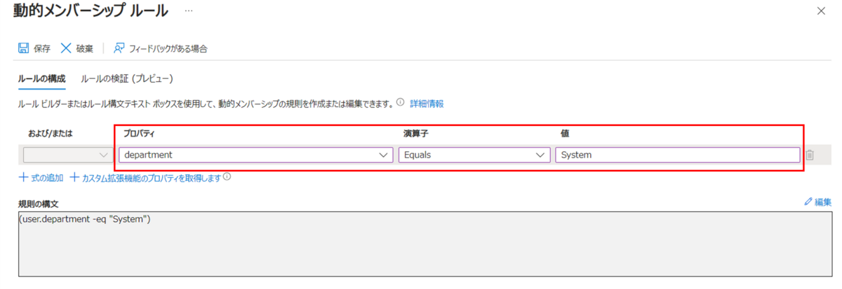 ※その他使用できるプロパティや演算子、値の詳細は以下の公開情報を参照ください。動的に設定されるグループ メンバーシップのルール - Microsoft Entra ID | Microsoft Learn - [ルールの検証(プレビュー)]から検証したいユーザーを追加することで、そのユーザーがルールに合致するか確認することができます。想定通りの結果となっていることが確認できたら、[保存]をクリックします。