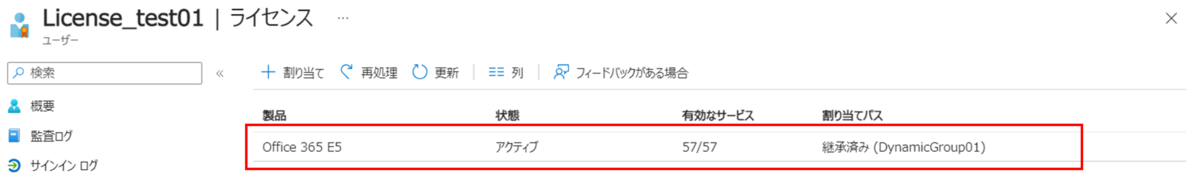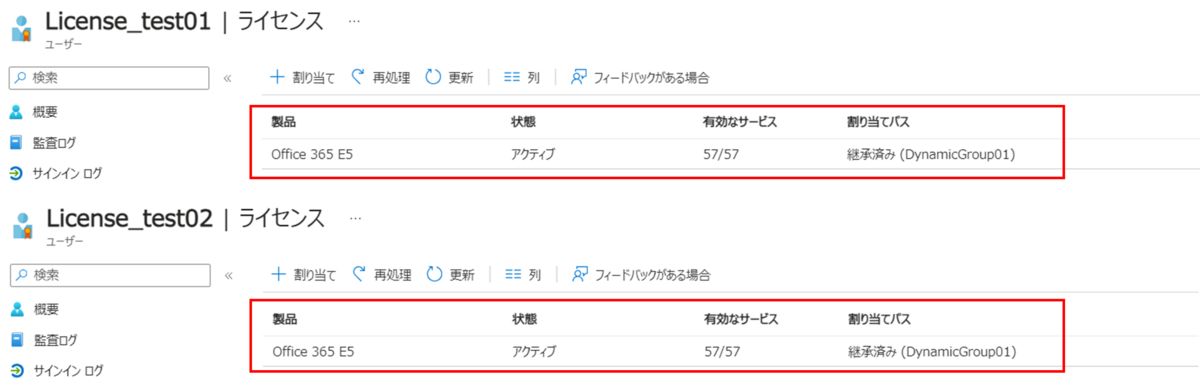所属ユーザーのライセンス状態を確認すると「License_test01」と「License_test02」にOffice 365 E5ライセンスが割り当てられています。