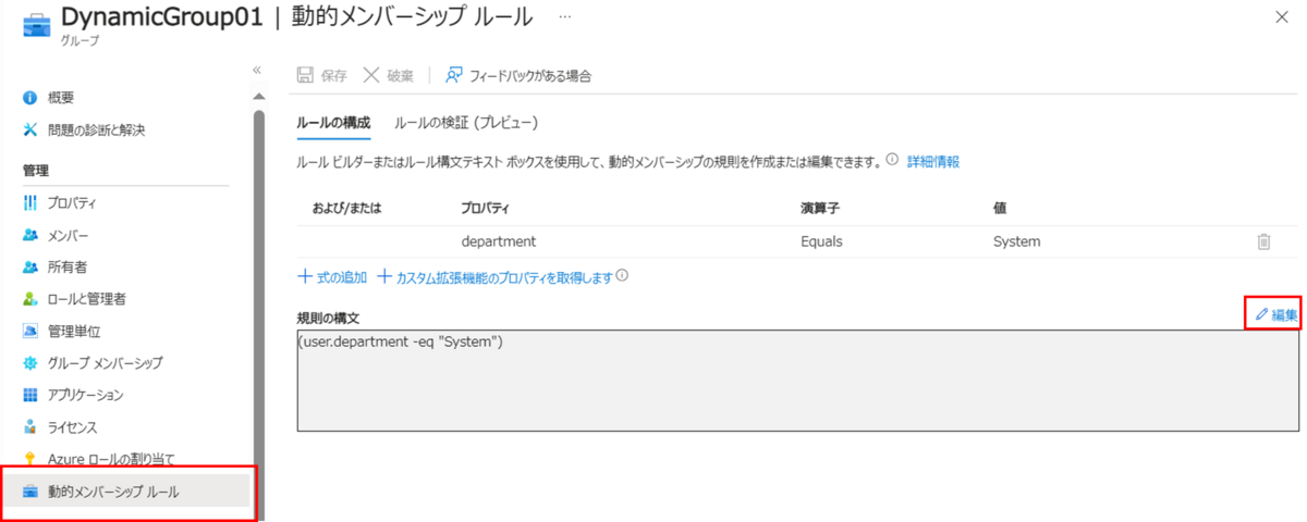 - ルールを変更するには、[動的メンバーシップルール]をクリックし、[編集]をクリックします。