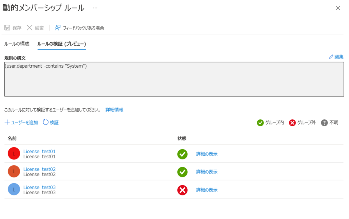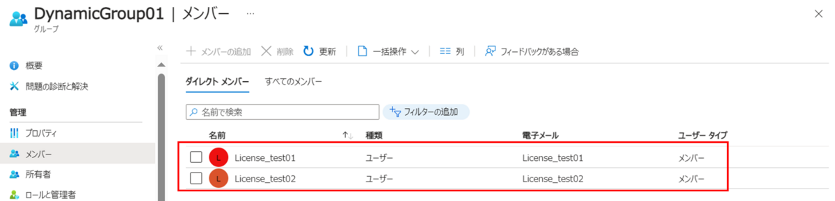 - 作成したグループを選択し、[メンバー]をクリックすると条件に合致したユーザーが表示されます。想定通り、「License_test01」のみが追加されています。