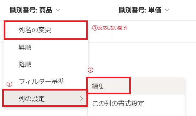 「列の設定」-「編集」をクリックします。(「列名の変更」はブラウザの問題か、私の環境では反応しませんでした。)