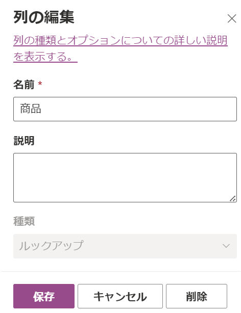 「その他のオプション」をクリックし、「ソース リストから列を追加」では、「商品」と「単価」を選択して「保存」をクリックします。