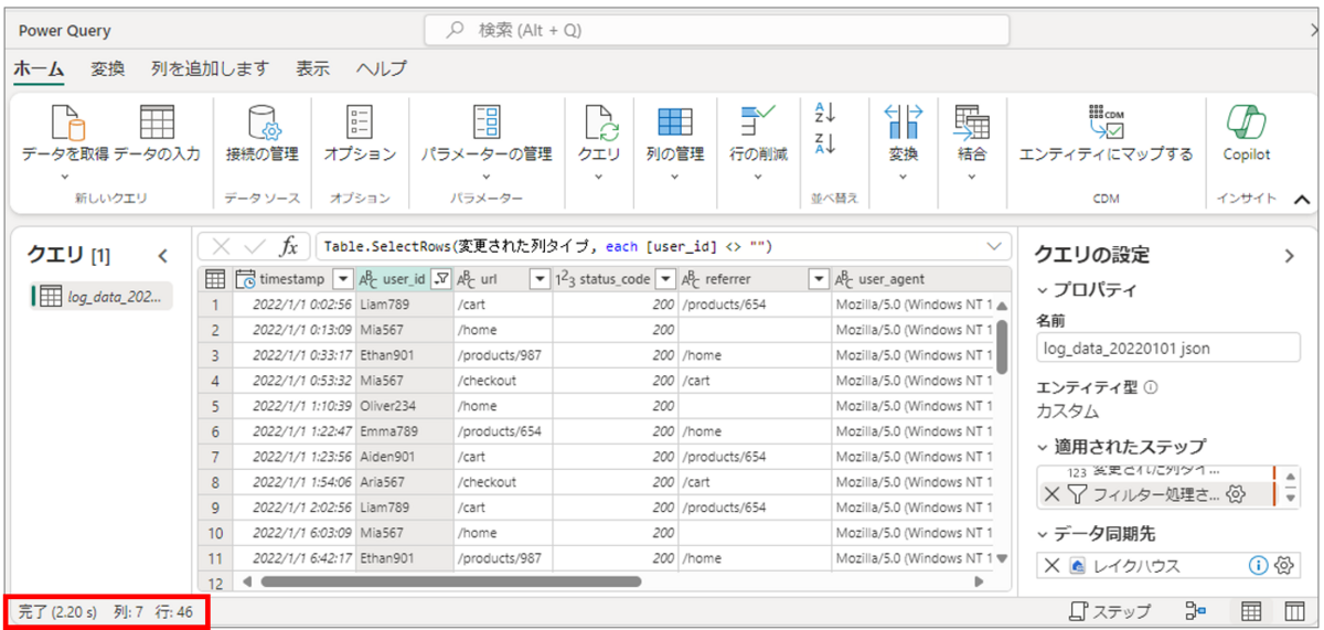 3.フィルタリング処理が完了し、user_idが空のデータが削除されたことを確認します。