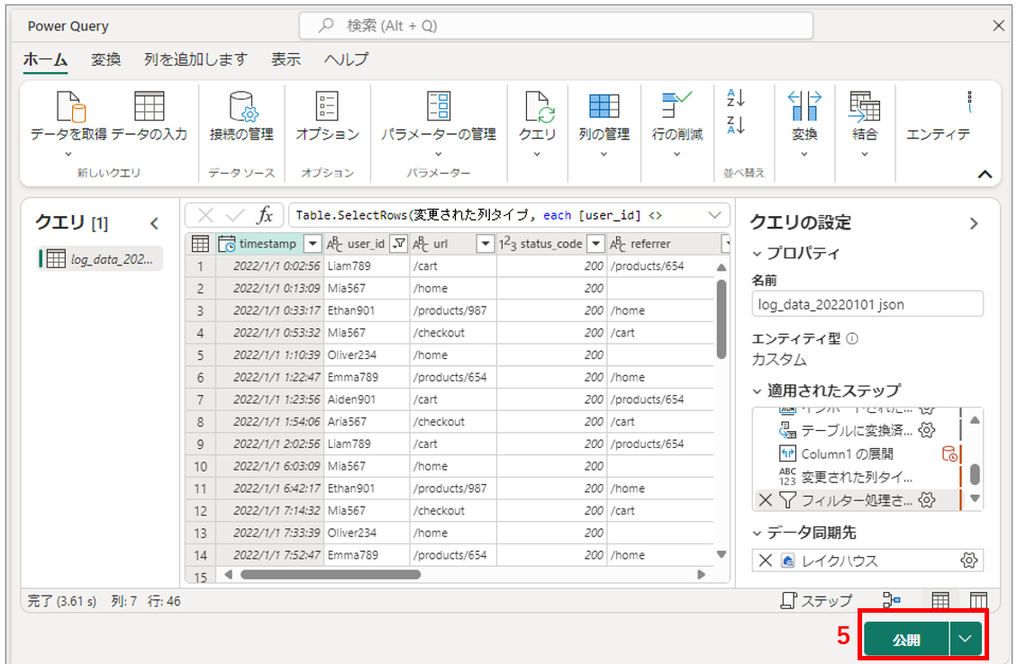 JSONファイルをテーブルに変換することでグラフを作成可能になるため、データフロー Gen2を使用してテーブル変換とレイクハウスへの格納を行います。