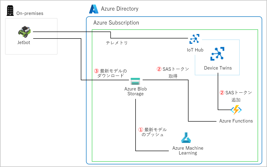 - JetBot側から、SASトークンの更新をトリガーに、モデルをダウンロードします。