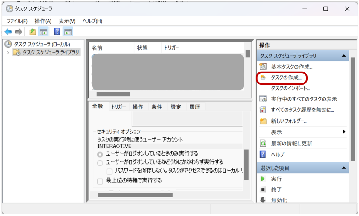 タスクスケジューラーを起動し、「タスクの作成」をクリックして、新規タスク作成画面を表示します。