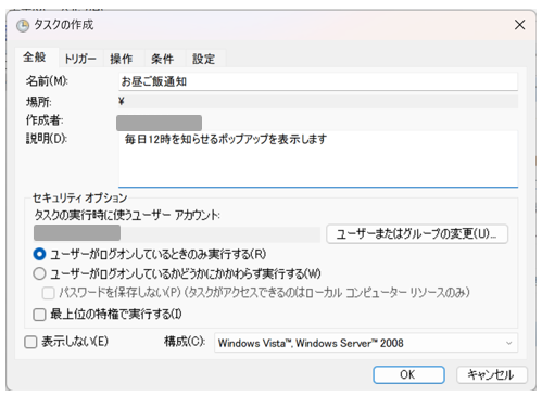 また、今回のポップアップは、PCを開いている時にのみ表示されればよいので、「セキュリティオプション」については”ユーザーがログオンしているときのみ実行する”を選択しておきます。