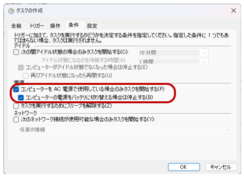 「条件」タブにて、タスク実行時の細かい条件を設定します。