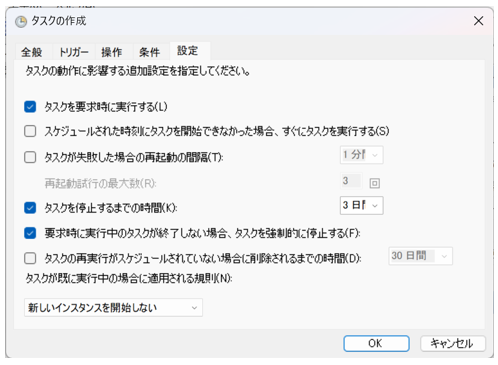 「設定」タブでタスクの動作に関する追加設定を指定します。