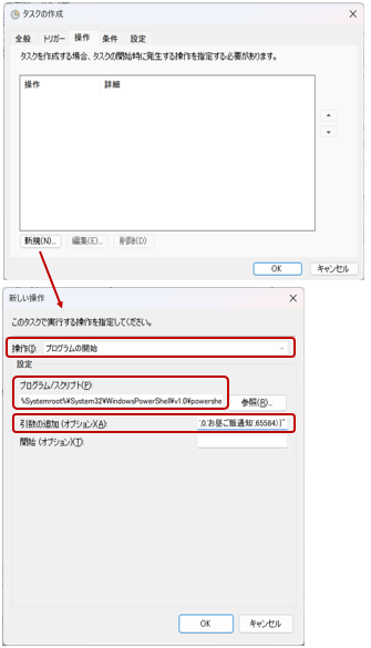 「新規」ボタンをクリックすると「新しい操作」画面が表示されるので、指定した時間に起動するプログラムと、その引数を指定します。