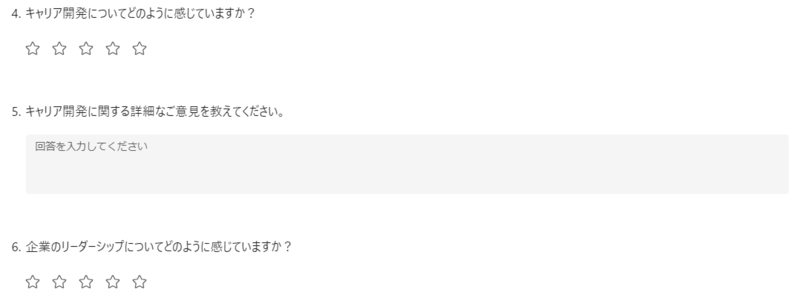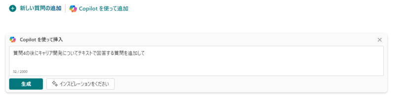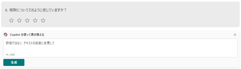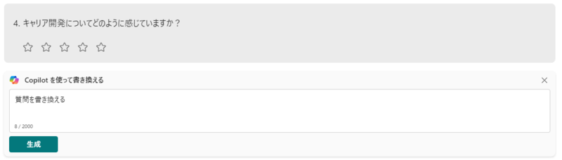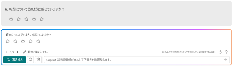 また、FormsのCopilot特有の注意点として、各質問に対してプロンプトを入力する際に、回答方法(☆評価、テキストなど)を修正することができないこともありました。