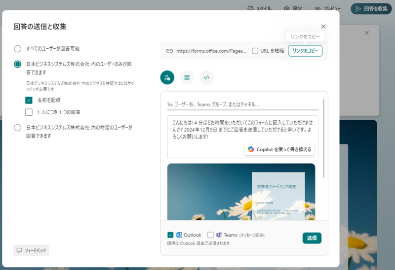 なお、フォームの完成後、回答の収集のためにメールを送信する際にも、Copilotが適切なメールの本文を提案してくれます。