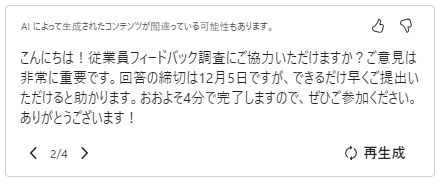 まず、生成AIを利用する際に共通する注意点ではありますが、Copilotが正しい質問、問題を生成したかどうかを、きちんと確認してから回答の収集を始める必要があります。