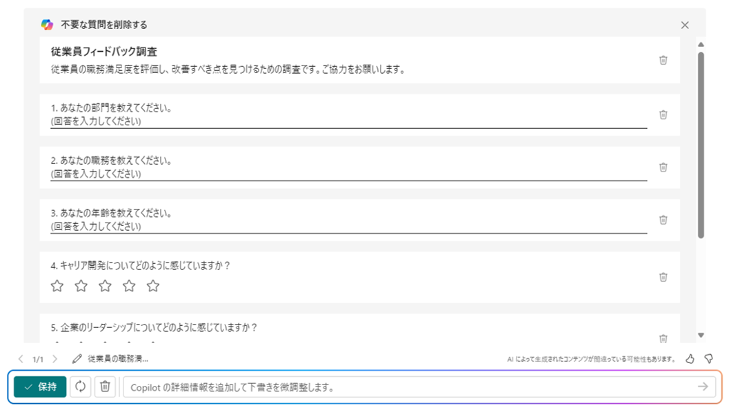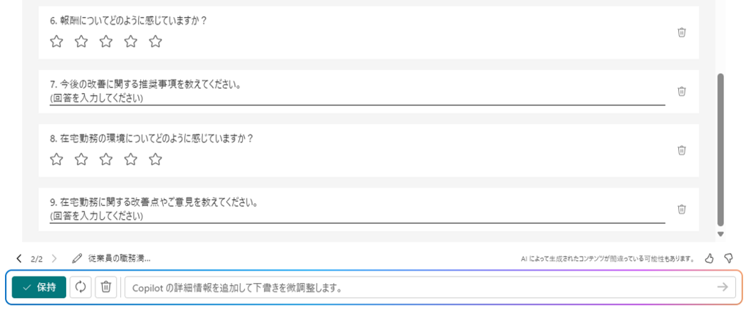 ここで「保持」をクリックしてCopilotが生成したフォームを保存することも可能ですが、追加でプロンプトを入力してフォームの内容を追加したり、修正したりすることも可能です。今回は、自宅勤務について2つの質問を追加してみます。