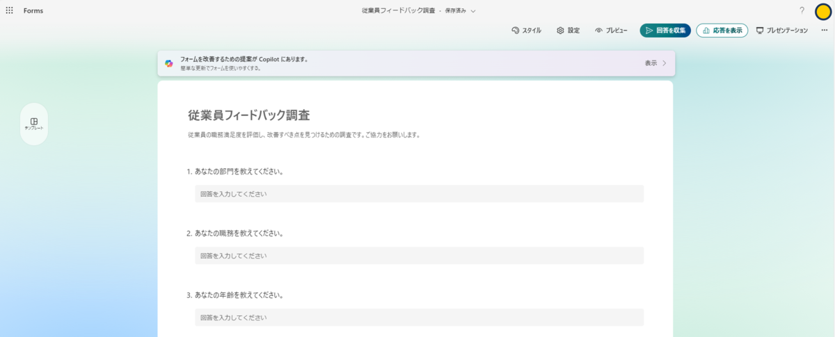 「フォームを改善するための提案がCopilotにあります。」の右の「表示」をクリックして、Copilotからの提案を確認します。
