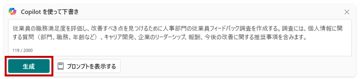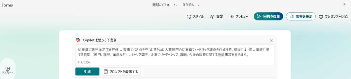 クリックすると、Copilotがプロンプトに合わせてフォームの下書きを自動生成します。