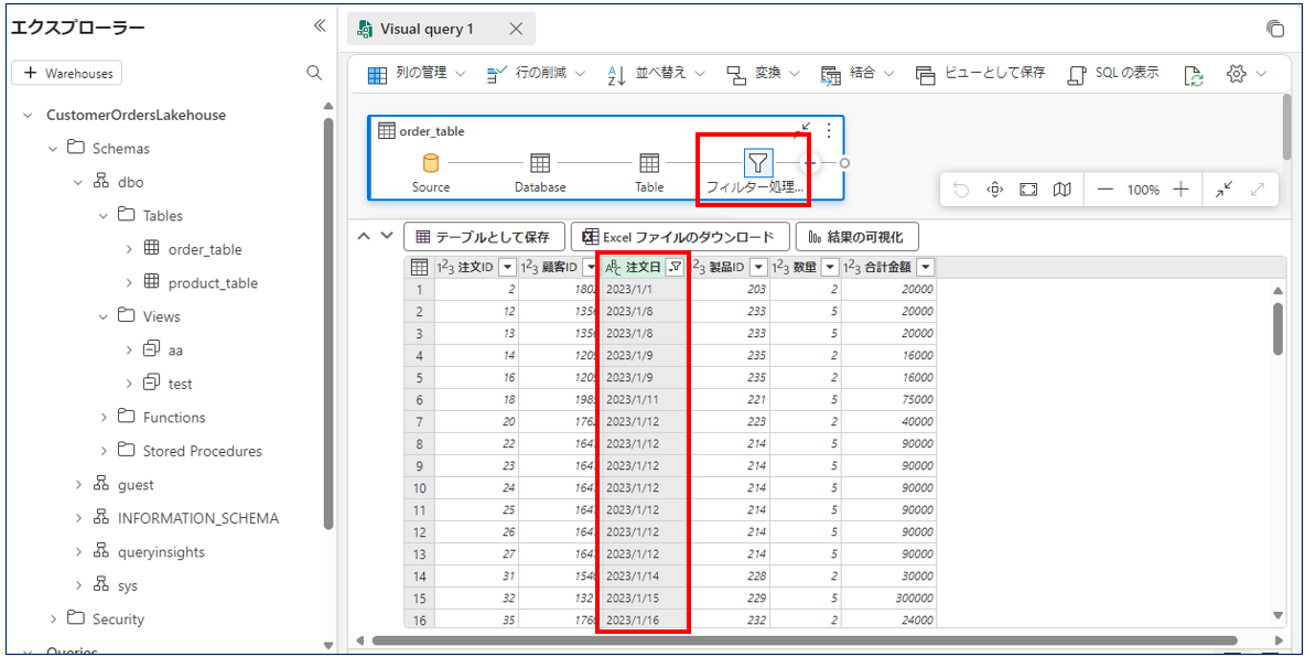 フィルタリング処理が追加され、2023年1月のデータのみを抽出したテーブルが表示されます。