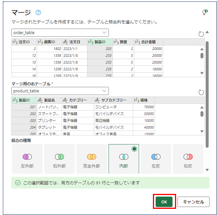 次に、製品IDをキーとして、order_tableとproduct_tableの結合を行います。「結合」 > 「クエリのマージ」を順にクリックします。