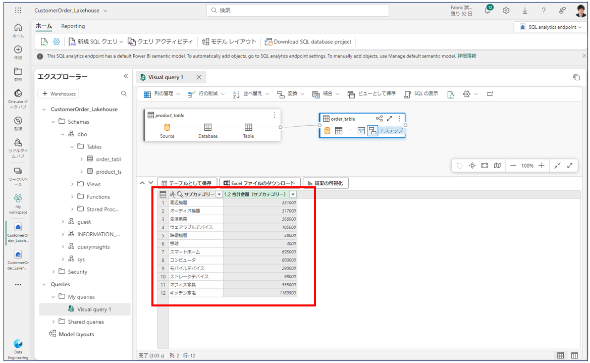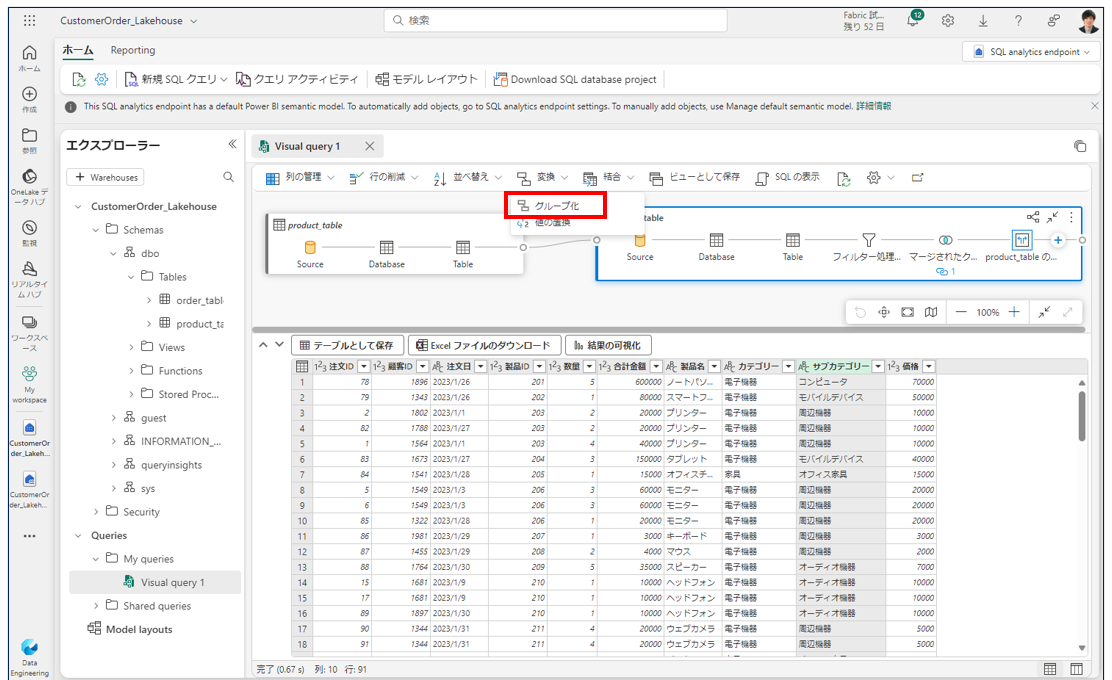 Microsoft Fabricのビジュアルクエリでは、SQLなどのコードを記述せずにデータベースクエリを作成することができます。