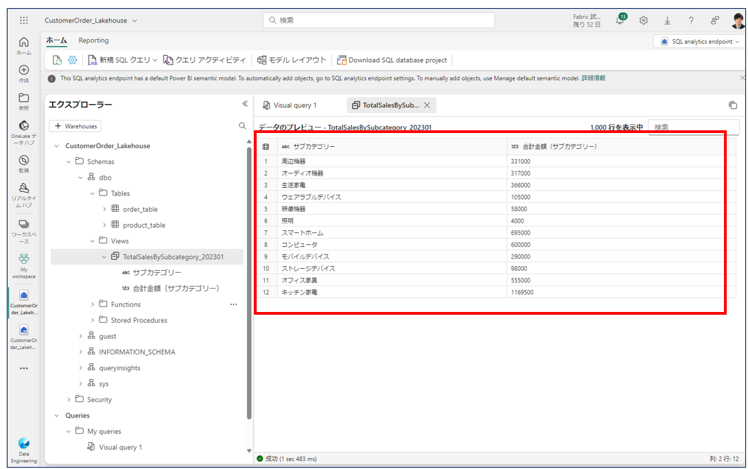 まずは、右上の「Lakehouse」をクリックし、「SQL分析エンドポイント」に切り替えを行います。