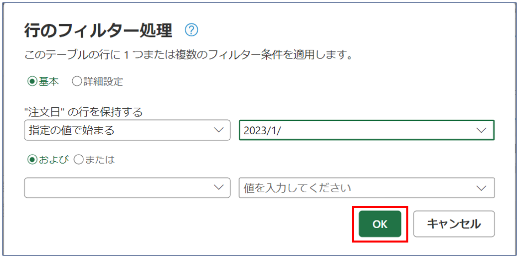 今回は、2023年1月のデータのみを抽出します。下図のように設定を記載し、「OK」をクリックします。