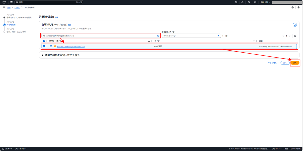 検索欄より「AmazonSSMManagedInstanceCore」と検索し、ポリシー名(AmazonSSMManagedInstanceCore)にチェックをいれ、「次へ」をクリックします。