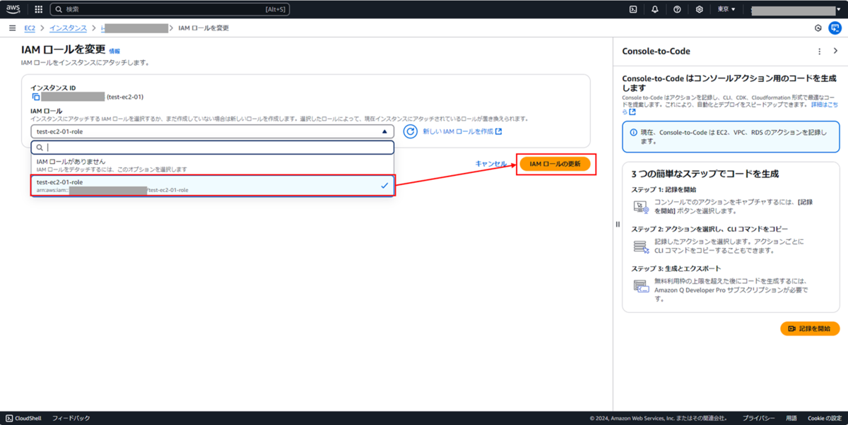 先ほど作成したIAMロールを選択し、「IAMロールの更新」をクリックします。