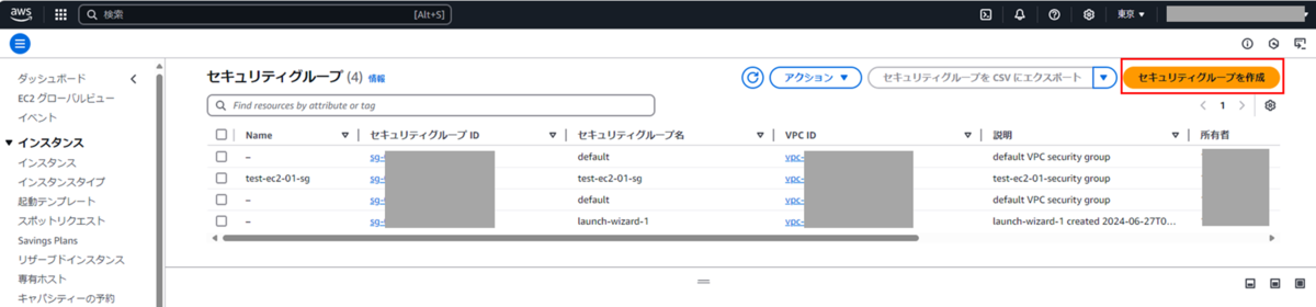 インバウンドルール追加後、「セキュリティグループを作成」をクリックします。