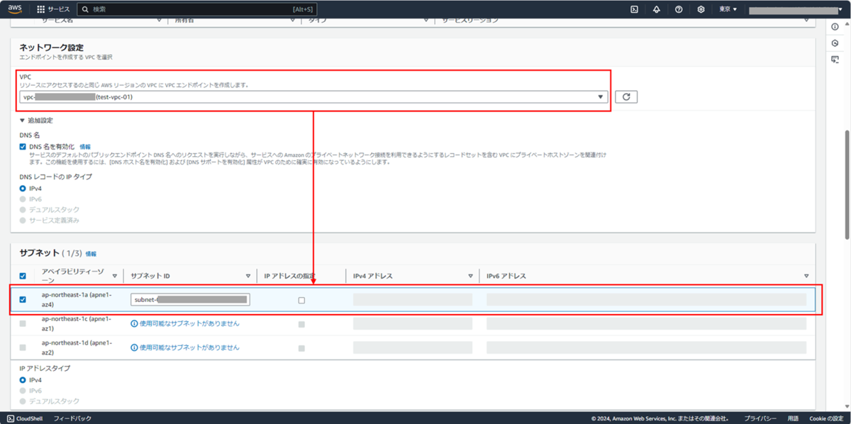 VPCエンドポイント作成するVPCを選択し、関連付けるサブネットにチェックを入れます。