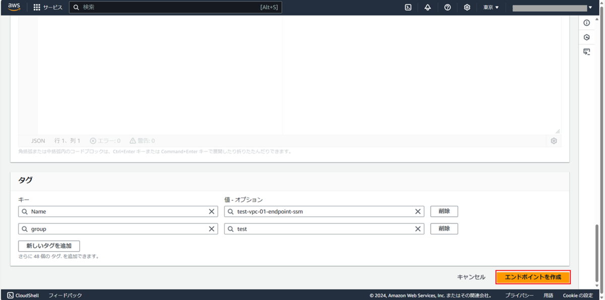 ※本手順では、VPCエンドポイント(com.amazonaws.region.ssm)の作成について記載いたします。その他、2つのVPCエンドポイントの手順についても同手順で作成します。