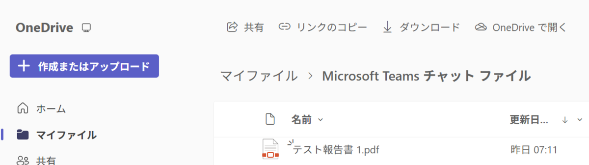 ※ Teamsのチャットに添付したファイルは、個人のOneDriveに以下のように格納されているため、このパスを指定します。