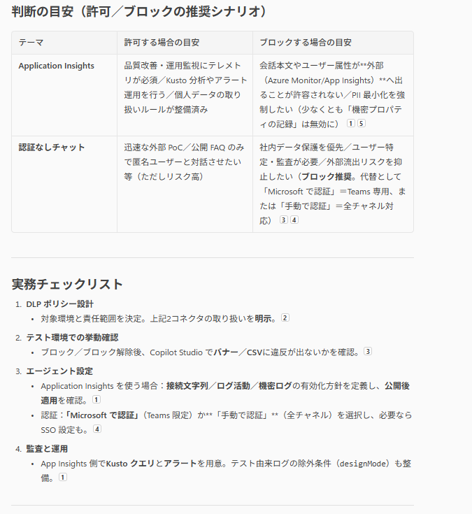 以下2つのCopilot Studioのコネクタについて、何を許可して何をブロックするのかを決定する材料が欲しい。