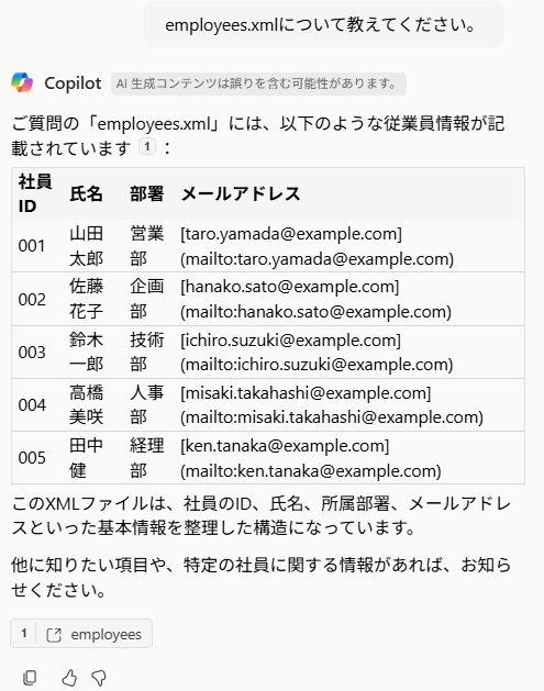 右下の「このサイトについて質問する」のテキストボックスからドキュメントライブラリ配下とそのフォルダ配下のxmlファイルについて質問します。
